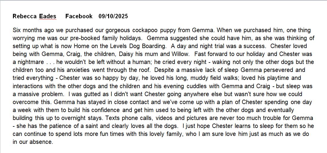 Our journey into home dog boarding has already begun, and it’s been such a rewarding experience and I’ve already received some complimentary comments on my Reviews page.  What started with looking after friends’ dogs has naturally grown into welcoming new clients and their much-loved dogs. Our two dogs absolutely love the extra company and have made plenty of new friends along the way! It’s been wonderful to see our home filled with happy, wagging tails — and we can’t wait to continue building our little dog-loving community.